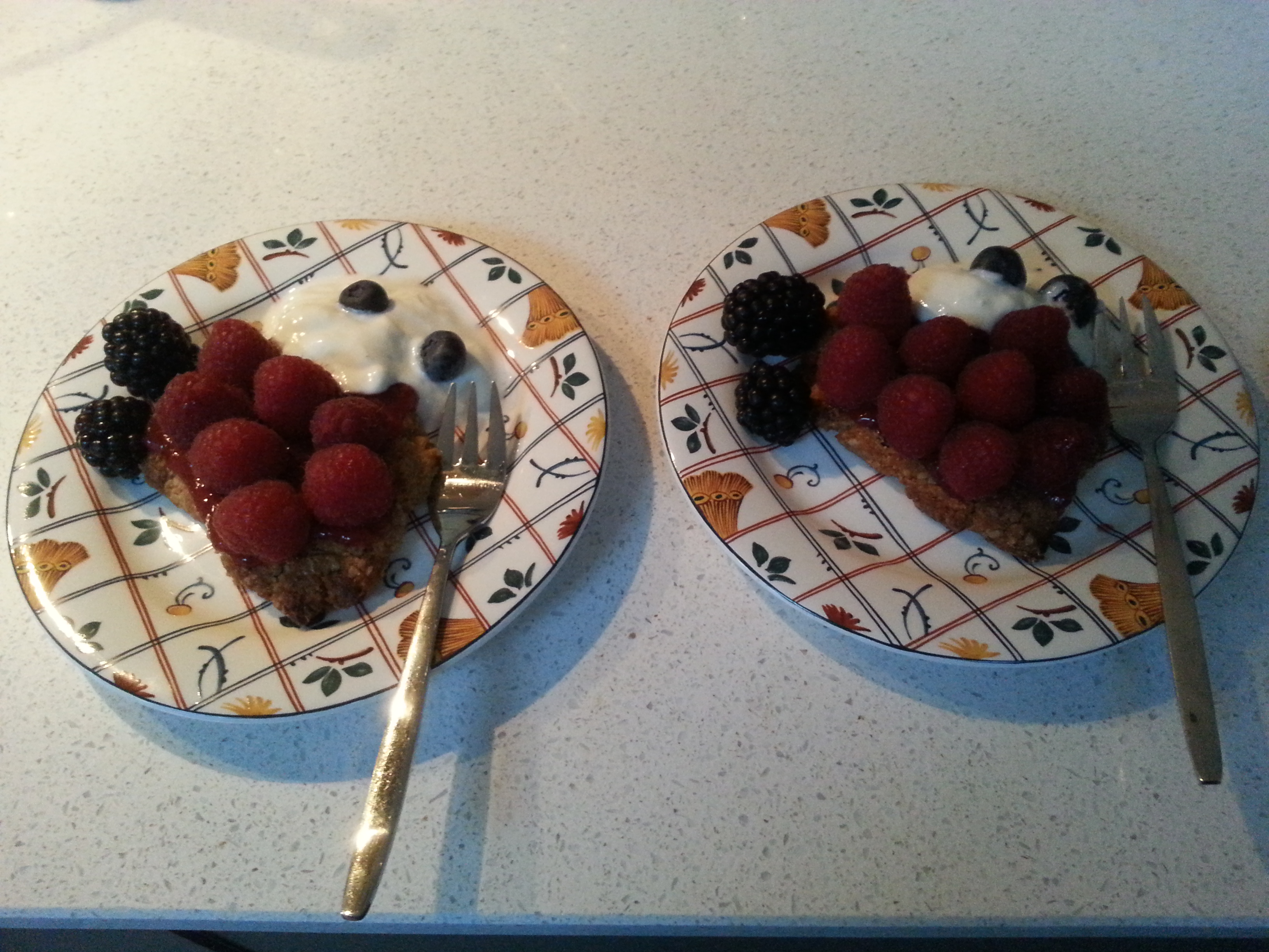Als taartbodempje: Dan smeer ik er wat zelfgemaakte en zelfgezoete vruchtenjam op, leg er wat framboosjes of blauwe bessen op en doe er een klodder griekse yoghurt (of soyajoghurt) naast op een bordje. En je toetje is klaar!