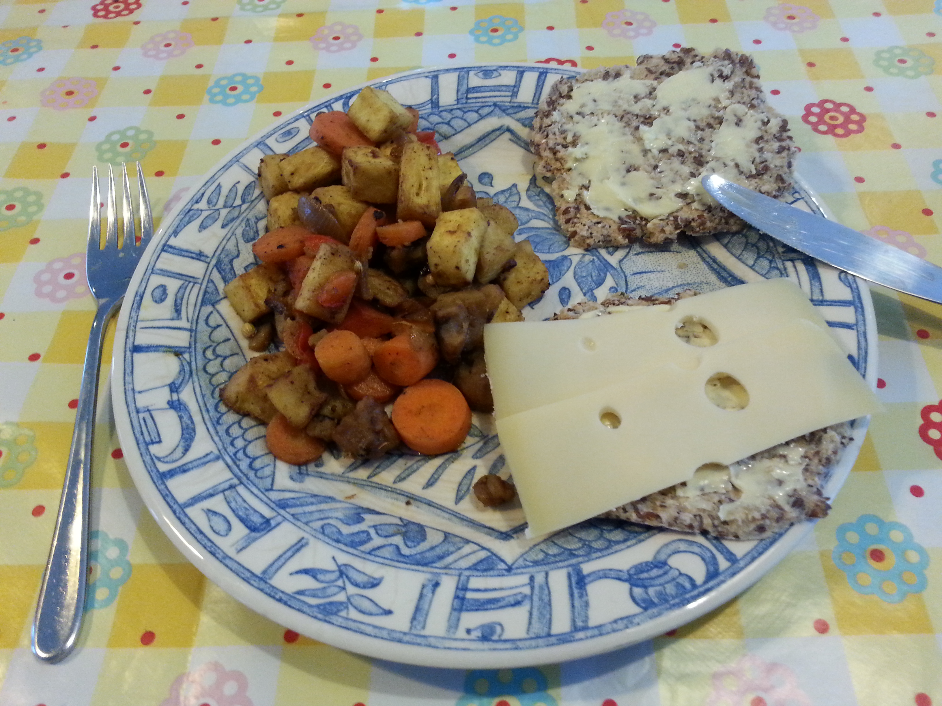 Fruit de ui in een wok met de knoflook. Doe er de knolselderij bij en bak even op hoog vuur, tot de knolselderij bruine randjes krijgt. Doe er de wortel en de paprika bij, de stukjes kastanje en de specerijen, peper en zout. Bak om tot het warm en (beet)gaar is. Klaar is je warme salade. Ik heb er koolhydraatarme crackers bij gemaakt met roomboter en leerdammer kaas.