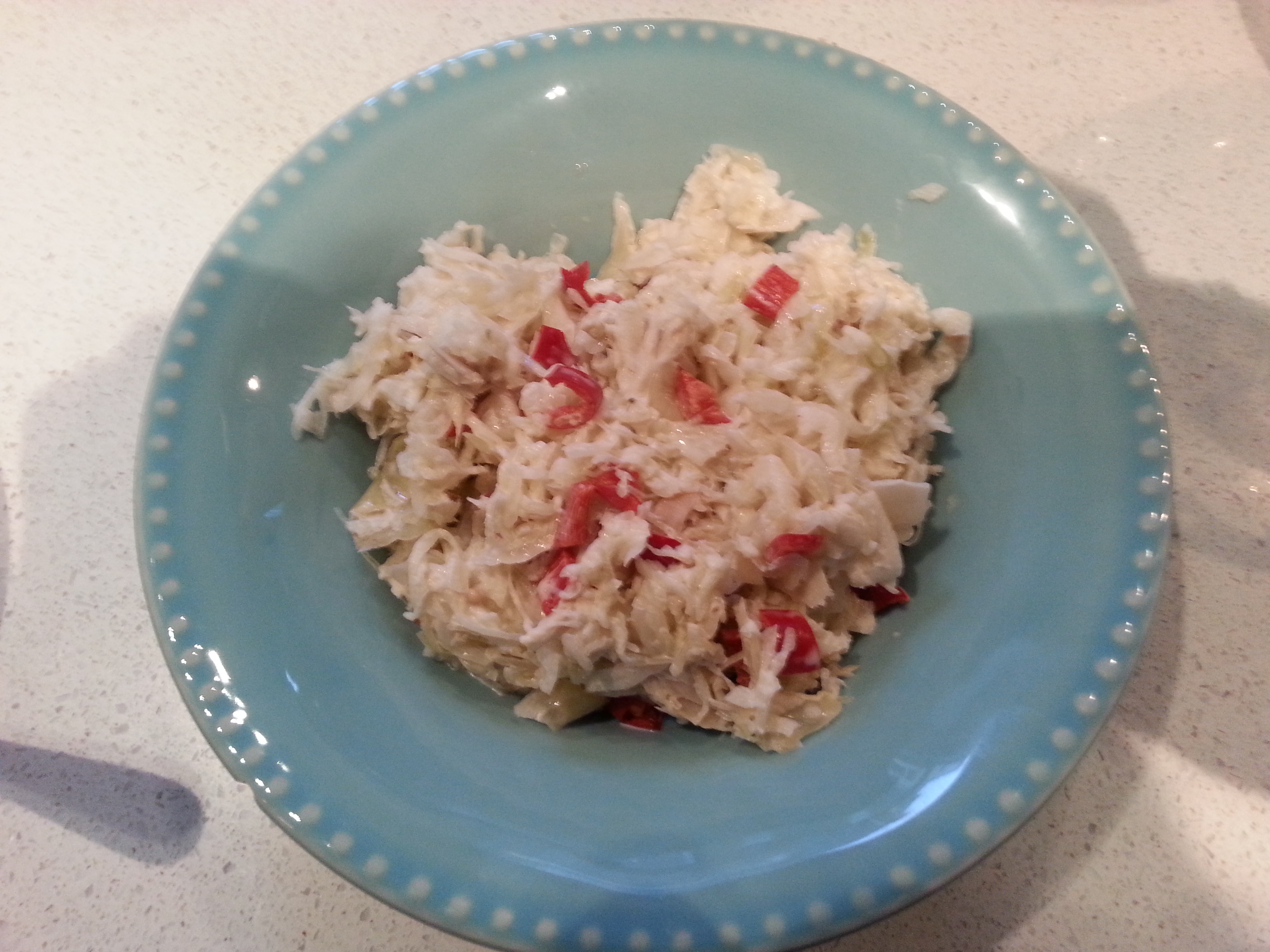 Maak de gekookte en uitgelekte zuurkool aan met de azijn en de lepel mayonaise en hussel. Snijd een halve makreelfilet in stukken en meng door de salade, evenals de rode peper stukjes. Voeg naar smaak wat peper toe en indien nodig een beetje zout. Klaar is je salade. Ik heb ‘m gegeten met aardperen/wortelsoep en crackers.