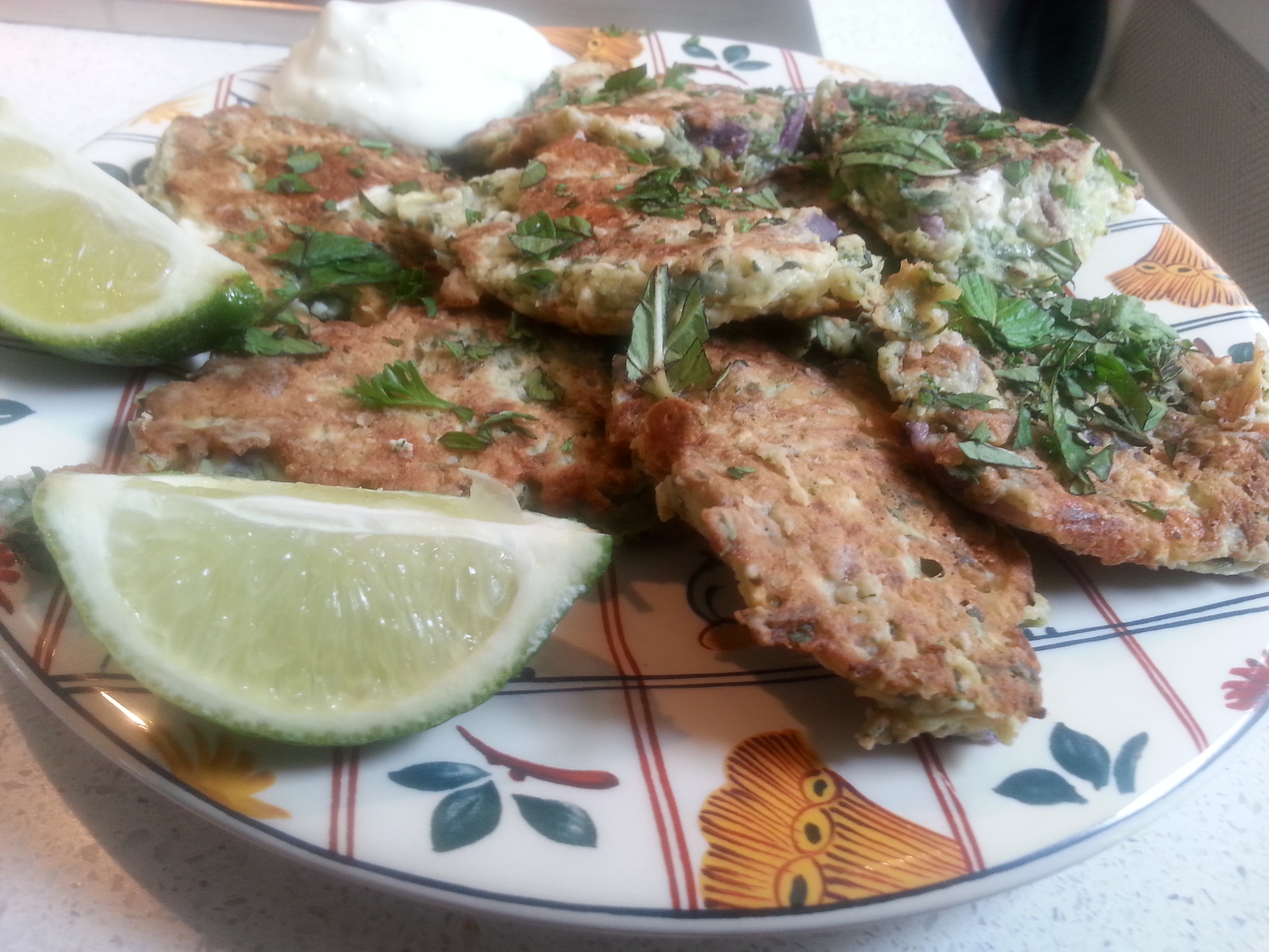 Doe olie in een koekenpan (of twee tegelijk!) en bak van het het beslag van twee eetlepels gevormde en wat platgemaakte pannenkoekjes. Keer ze na een paar minuten om tot beide kanten mooi bruin zijn. Laat ze afkoelen op een groot bord of schaal waar een kommetje griekse yoghurt, gemengd met een uitgeknepen teentje knoflook en peper en zout, in het midden kan. Besprenkel ze tussen het optasten door met limoensap. En strooi er als laatste nog wat geknipte koriander overheen. Heerlijk voor de picknick of als zomerse maaltijd met een groene salade. Wat over is kan de volgende dag mee naar het werk als gezonde lunch.