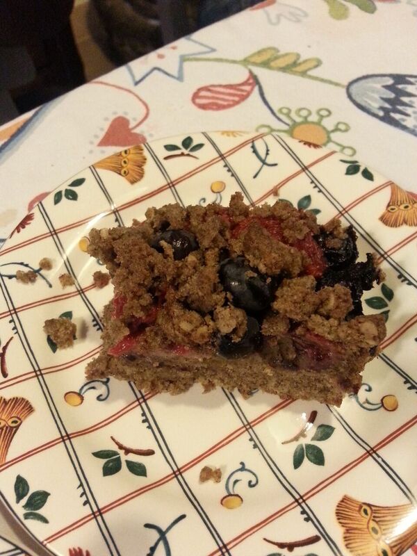 Ik hou ervan om op zondag in plaats van de krant een paar inspirerende kookboeken te lezen. Ik kwam dit recept tegen in het Zomerboek van Homemade van Yvette van Boven. Ik heb ‘m een beetje aangepast voor de glutenvrije en suikervrije (bijna dan) medemens. Daardoor is ie ietsje zwaar geworden (ik heb boekweitmeel en amandelmeel gebruikt) en de kruimelbovenkant zag er qua kleur uit alsof het gehakt was. Suggesties zijn welkom. Wellicht moet ik toch het glutenvrije witte meel van Damhert gebruiken. De smaak is in ieder geval heerlijk. Gewoon niet teveel van eten.