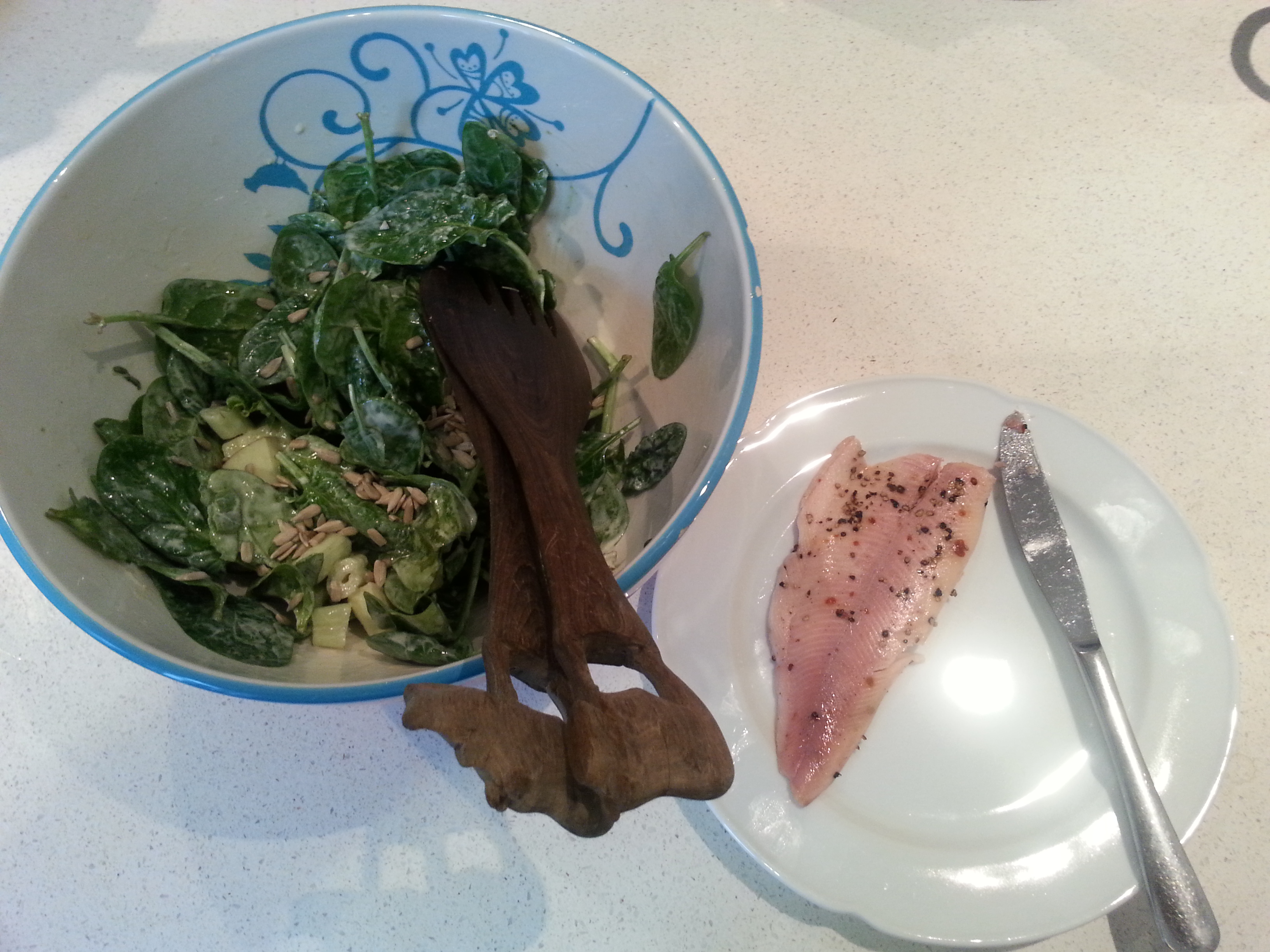 En voor de lunch heb ik een gerookt forelfiletje (Lidl) gegeten met spinaziesalade met appel, bleekselderij en zonnebloempitten. Voor de dressing heb ik weer de zelfgemaakte mayo gebruikt, aangelengd met wat olijfolie en appelazijn, en wat extra peper en zout toegevoegd. Heerlijk!
