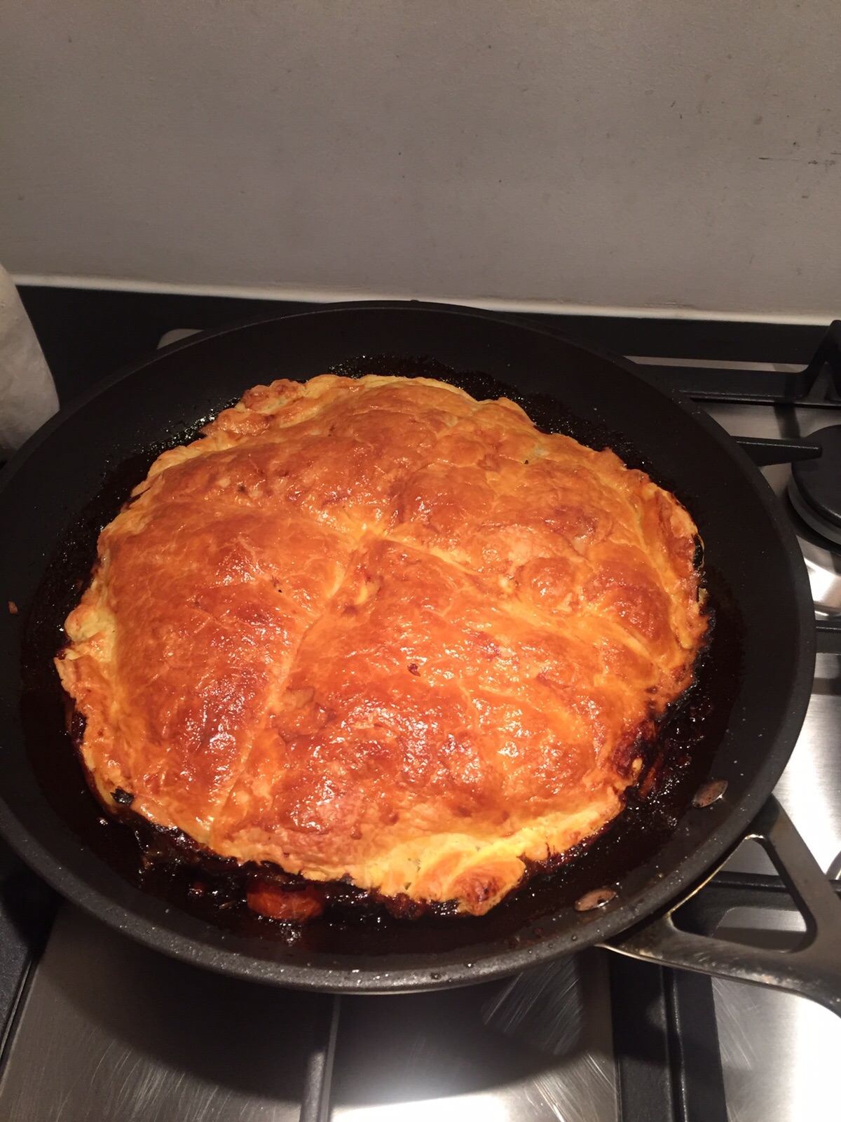 Prik 6 gaatjes in het deeg. Kluts een eitje en smeer het bladerdeeg in met het ei .