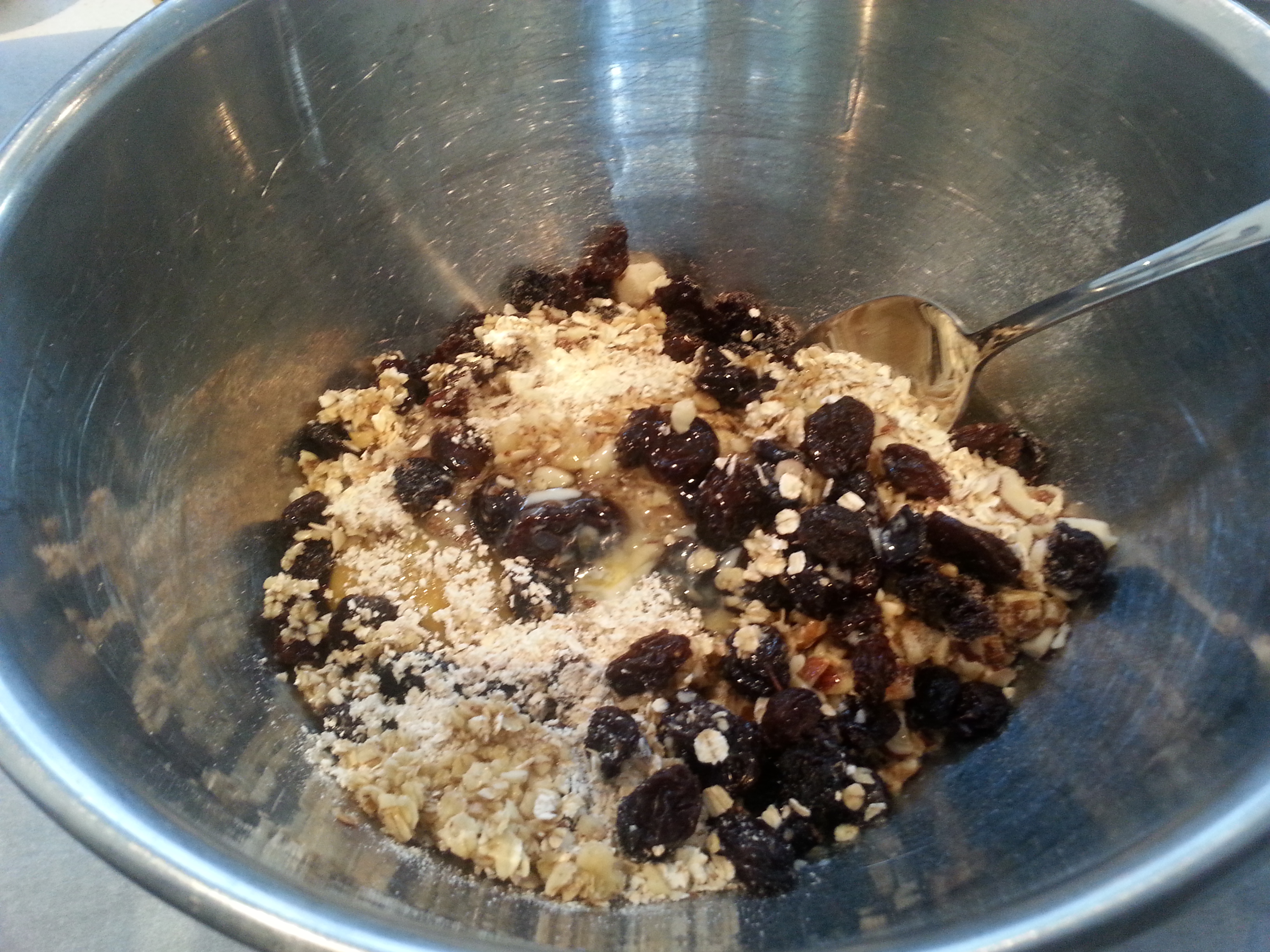 Meng alles doorelkaar tot een beetje een plakkerig deeg. Vorm op een met bakpapier beklede bakplaat hoopjes die je met twee vorken tot vierkante platte koekjes maakt. Zet ze ongeveer 13 minuten in de voorwarmde (180℃) oven. Als ze eruit komen zijn ze nog een beetje slap. Laat ze afkoelen voor je ze in een trommel doet.